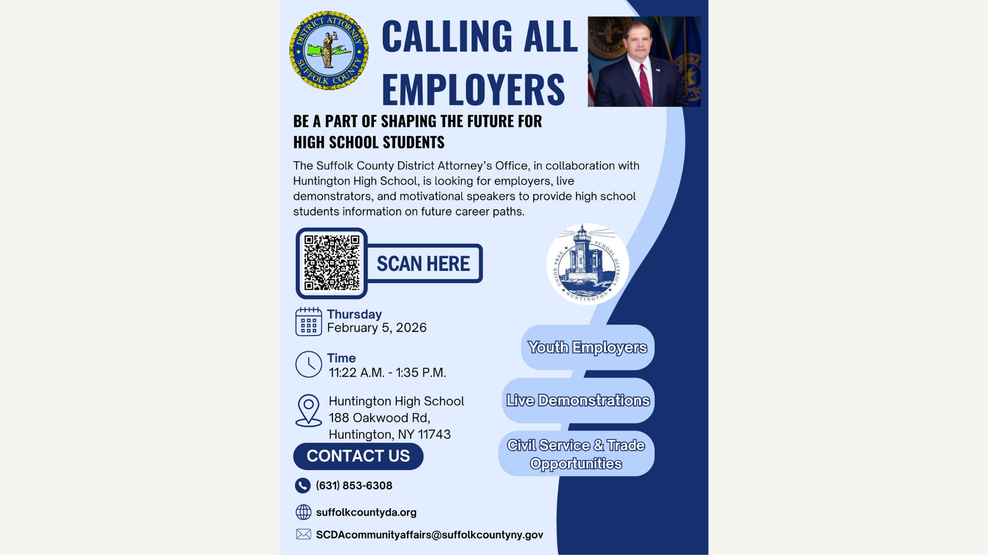 Description: Calling All Employers! The Suffolk County District Attorney’s Office of Community Affairs, in partnership with Huntington Union Free School District, invites you to join us for an upcoming Career Planning Event for students. This event provides an excellent opportunity to connect with the next generation of professionals and share valuable insights about your industry.