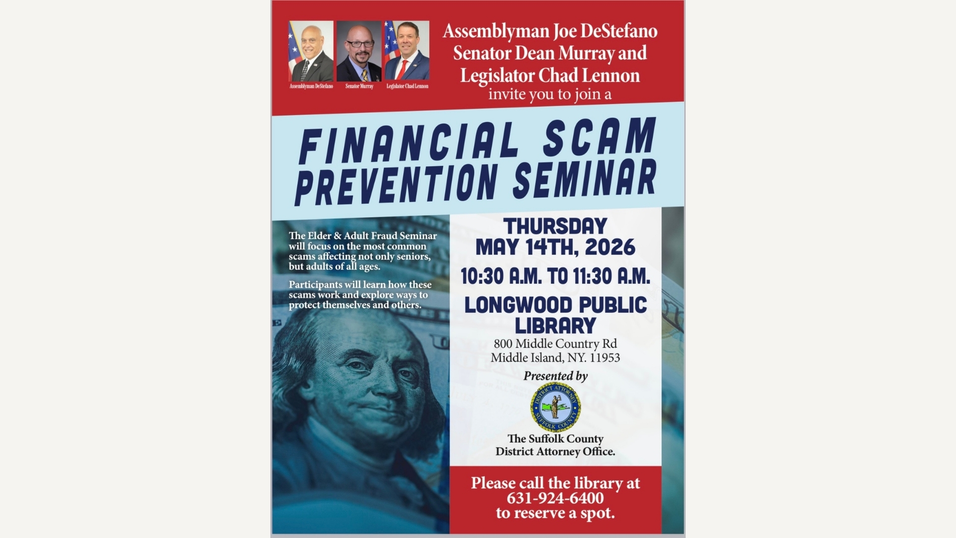 May 14, 2026 10:30 a.m. - 11:30 a.m. Financial Exploitation of Seniors Presentation Longwood Public Library 800 Middle Country Road Middle Island, NY 11953 Description: Join the Suffolk County District Attorney’s Office in partnership with Assemblyman DeStefano, and Senator Dean Murray for an informative presentation on financial exploitation. Learn about the latest scams and practical […] |
